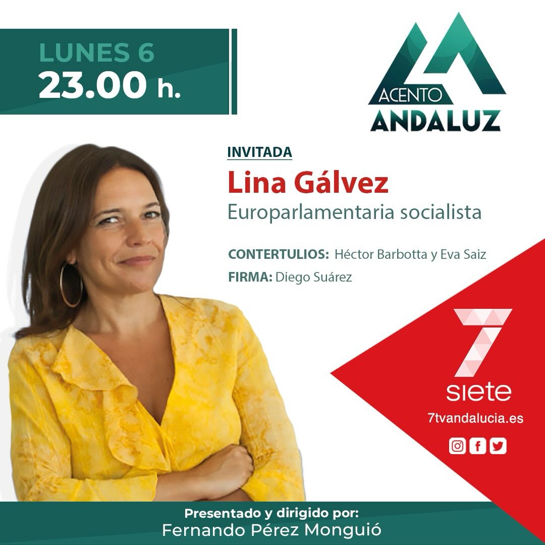La eurodiputada Lina Gálvez participará este lunes 6 de abril en Acento Andaluz, un programa de actualidad andaluza, dirigido y presentado por Fernando Pérez Monguió, que se emitirá a las 23:00 horas por todas las televisiones de 7TV en Andalucía.